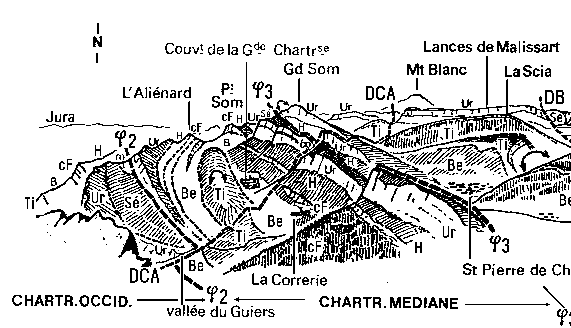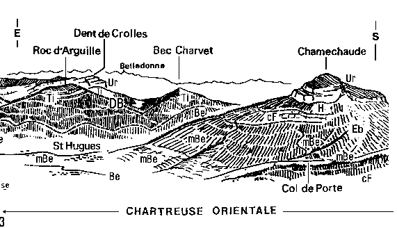 ![]() Partie sud-est : transversale de la montagne de Chamechaude. dB = décrochement de Bellefond et son prolongement, des Bachassons, à Chamechaude. |