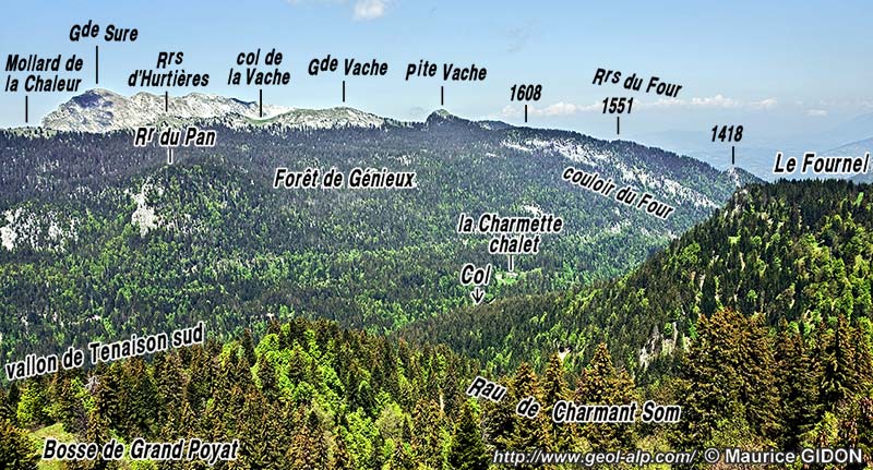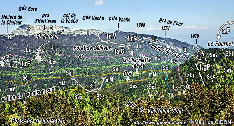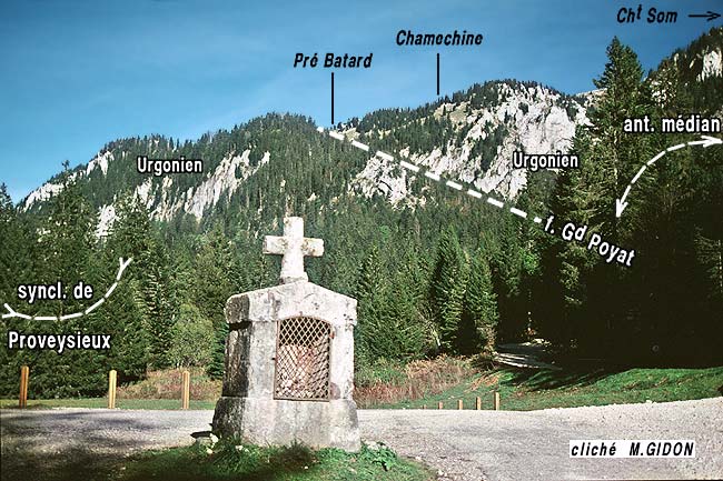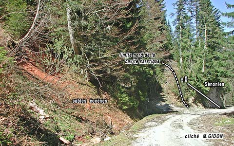 Toutefois en gagnant, un peu plus au NW, le Chalet de la Charmette, on peut y observer la succession des couches sénoniennes du flanc ouest du synclinal de Proveysieux, sur quelques centaines de mètres le long du début du chemin menant au col de la Grande Vache. Du côté opposé, oriental, le chemin forestier du vallon de l'Oursière a été élargi, ce qui a mis à nu des sables éocènes qui reposent sur les bancs sénoniens du flanc oriental du synclinal. |