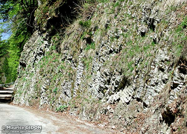 On atteint ainsi (à l'altitude de 1160 m) un pont qui fait passer de en rive gauche (orientale) du vallon : immédiatement après ce pont la route franchit un passage en entaille, en amont duquel le pendage de la stratification (de l'ordre de 60° vers l'ouest) est bien visible grâce à la présence de petits lits marneux ; ces derniers sont d'ailleurs porteurs de traces variées, dues aux mouvements de l'eau lors de leur dépôt.
