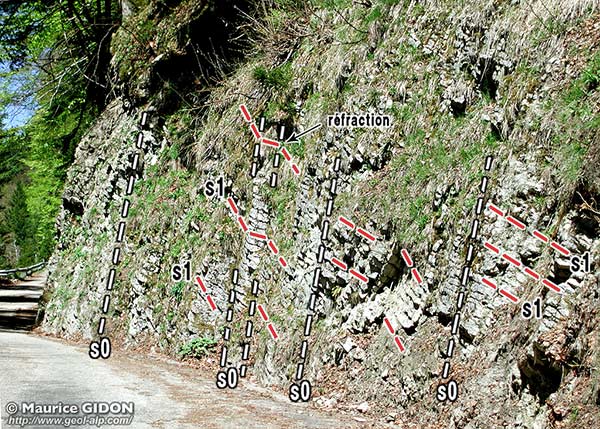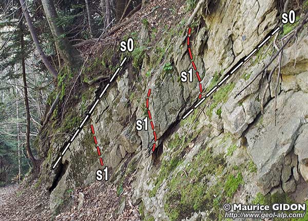 La schistosité et la stratification y sont souvent difficilement discernables l'une de l'autre, mais on peut particulièrement bien analyser leurs rapports trois kilomètres au nord de Pomaray (c'est-à-dire un peu moins de 4 km sous le col de La Charmette), aux alentours du point coté 992 des pentes ouest du Bois Chourot.