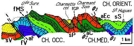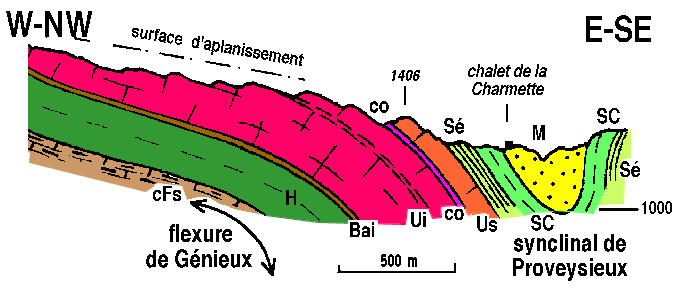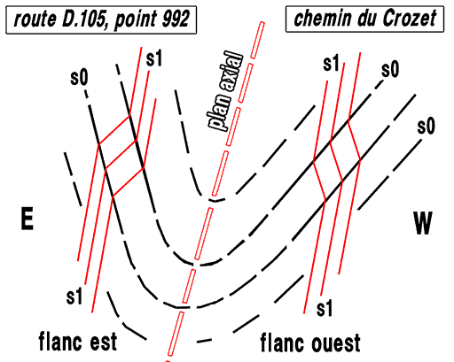 En fait les couches sont surtout ici dans une situation symétrique par rapport au plan axial du synclinal de Proveysieux (voir le schéma ci-après).