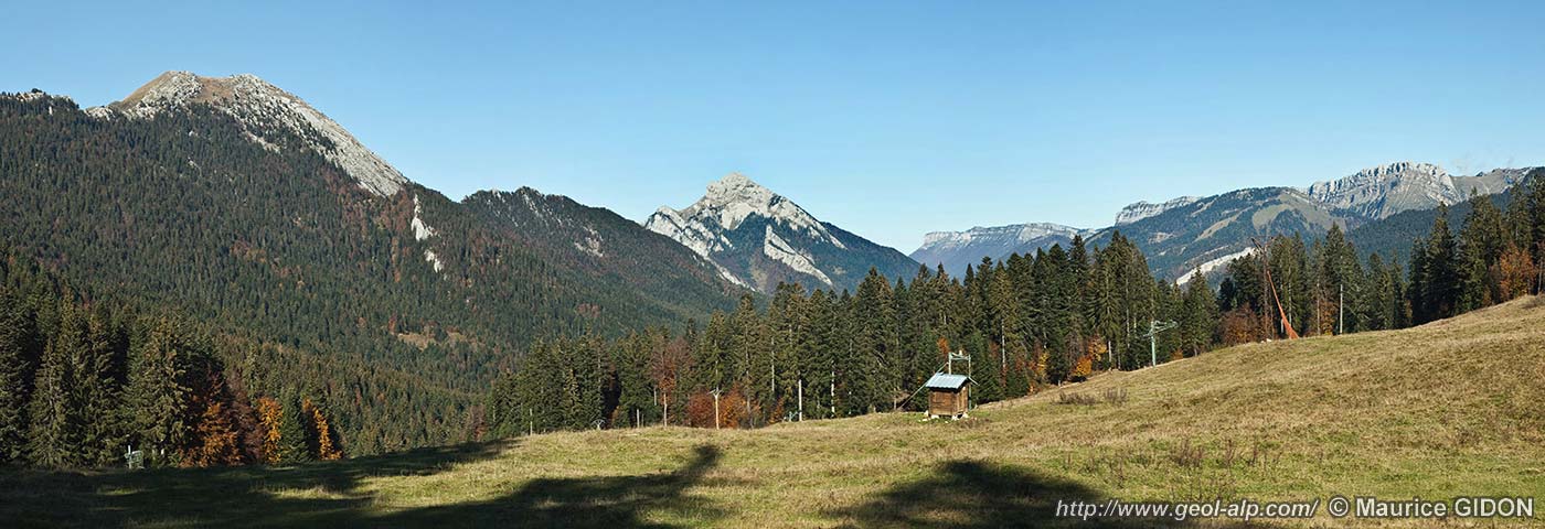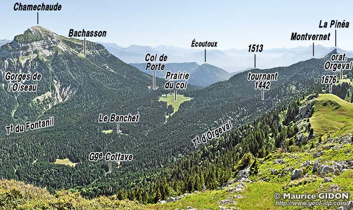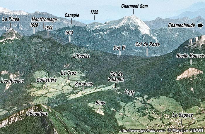 Le cliché ci-dessus met en évidence la faible distance séparant les axes de l'anticlinal de l'Écoutoux et du synclinal du Sappey dans le versant ouest de Chamechaude (entre