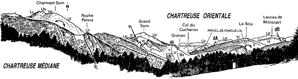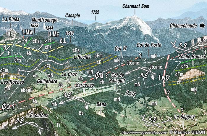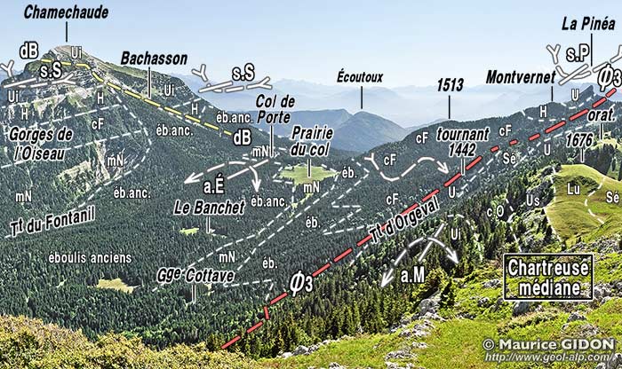 ![]() s.S = synclinal du Sappey ; D.B = décrochement de Bellefond - Bachasson : noter le décalage des deux tronçons d'Urgonien du synclinal ; a.É = anticlinal de l'Écoutoux ; s.P = synclinal de la Pinéa (une des ondulations du flanc occidental du pli précédent) ; Ø3 = surface de chevauchement de la Chartreuse orientale ; a.M = anticlinal du Charmant Som. Le "tournant 1442" (de la D.57d) est localisé sur cette image parce que c'est un point d'observation remarquable, dont les affleurements sont décrits à l'occasion d'une page spéciale. |