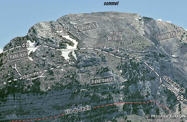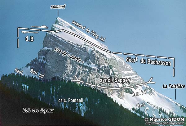 ![]() Détail de la pente occidentale sommitale du sommet de Chamechaude, vu du nord-ouest, depuis le sommet de Canaple. d.B = tracé du décrochement des Bachassons. Les mentions "flanc ouest" et "flanc est" se rapportent à la position, par rapport à la charnière du synclinal, des panneaux rocheux qu'ils qualifient : de part et d'autre de la cheminée ouest le décrochement juxtapose une portion du flanc ouest (à gauche) avec un panneau appartenant au flanc est qui intéresse, à droite, toute la dalle urgonienne jusque bien zu delà de la limite du cliché. |
