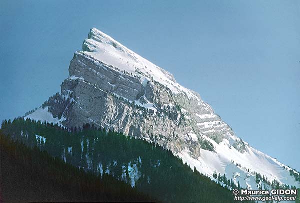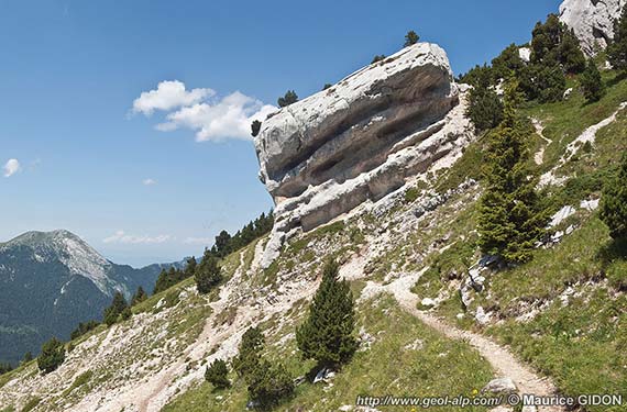 Si le regard est orienté selon l'azimut des couches (comme dans le cliché ci-dessus) on constate que ce niveau change de pendage en direction de l'ouest et décrit ainsi le synclinal du Sappey : cela se passe trés précisément au niveau de l'éperon un peu boisé que le sentier descendant du Jardin contourne avant de s'engager dans la face ouest et d'y suivre la vire que suit ce niveau, par laquelle on rejoint le pied de la cheminée ouest (voir le cliché suivant).