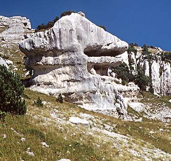 ![]() Extrémités de rameaux de polypiers branchus : Urgonien inférieur de Chamechaude (Chartreuse), le long du sentier, dans la prairie, vers 1900m d'altitude (cliché aimablement communiqué par M. Grégoire Sterbecq). |
