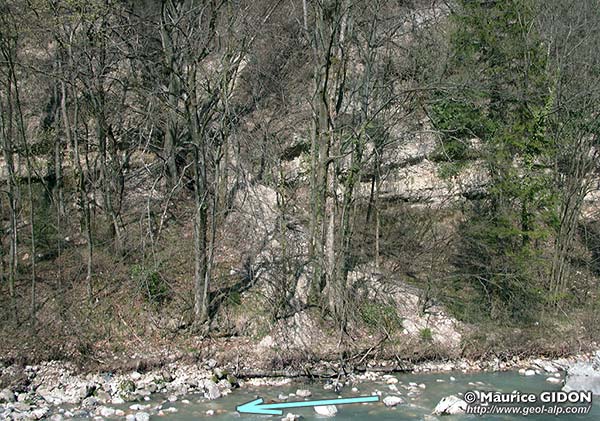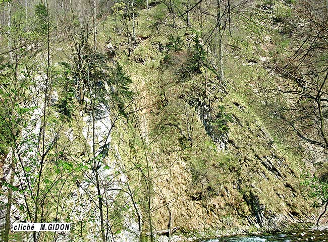 rochers de rive droite du Guiers vus de la rive gauche, dans l'azimut des surfaces de couches |