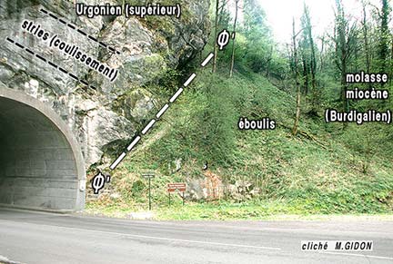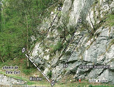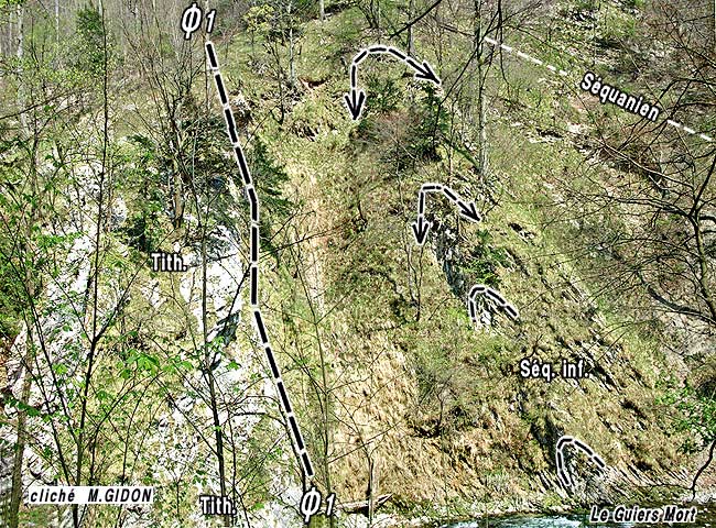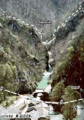 Le défilé de Fourvoirie 2b et 2c représentent les emplacements des deux points de stationnement indiqués sur la coupe. Ø' et Ø1 = sont les deux surfaces tectoniques (failles majeures) encadrant la zone cisaillée qui correspond ici au chevauchement de la Chartreuse occidentale. Toute la succession Jurassique supérieur - Crétacé inférieur (plus de 1000 m d'épaisseur originelle) est condensée par la déformation tectonique en moins de 300 m. Mais cet amincissement se fait non pas par étirement ductile mais par tronçonnement par le jeu de plusieurs cassures. |
