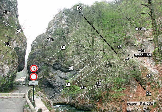 En fait dans cette épaisse barre rocheuse sont conservées les seules couches particulièrement résistantes des niveaux successifs de ce flanc du pli, c'est-à-dire les plus calcaires. Elles sont débitées en plusieurs tronçons qui se juxtaposent entre deux cassures majeures : celles-ci limitent ce que l'on peut considérer comme un large couloir de cisaillement et c'est donc cette tranche tectonisée (et non une surface unique) qui représente ici le chevauchement de la Chartreuse occidentale.