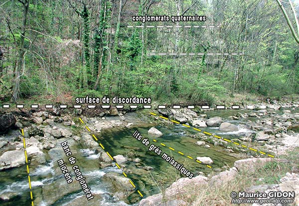 Ces lits de conglomérats reposent en discordance sur le bedrock qui affleure au fond même du lit de la rivière.
