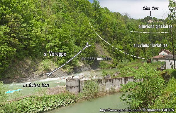 Après sa sortie du défilé de Fourvoirie le Guiers Mort décrit plusieurs sinuosités entre des pentes boisées plus douces, avant de rejoindre Saint-Laurent-du-Pont. Son cours entaille là des alluvions quaternaires qui masquent presque complètement leur bedrock. Il est repoussé vers le nord par le glissement de terrain de matériel morainique de sa rive gauche qui a partiellement détruit en 1935 les bâtiments de l'ancienne distillerie des chartreux. De ce fait sa rive droite entaille en abrupts boisés les alluvions fluviatiles plus anciennes (conglomérats interglaciaires) de sa rive droite.