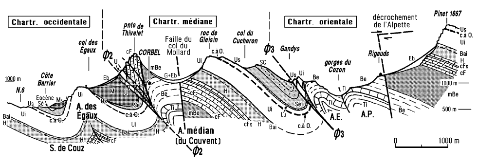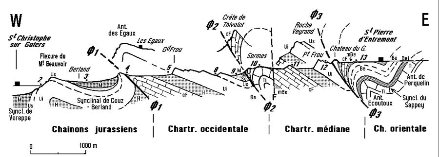 ![]() Coupe de la rive gauche du Guiers Vif en aval de Saint-Pierre-d'Entremont Coupe selon le tracé de la route D.520c (les numéros sont les point d'observation décrits dans le fascicule 1-i, consacré à cet itinéraire) F = faille du col du Mollard. |