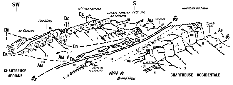 Depuis le Frou jusqu'au pied est de l'éperon rocheux au revers ouest duquel s'appuie le hameau du Châtelard la route traverse, dans le sens stratigraphiquement descendant, le flanc oriental de l'anticlinal occidental, jusqu'aux calcaires du Fontanil.