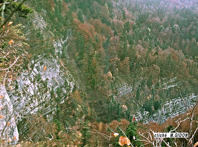 On peu aussi observer cette faille de Mont-Saint-Martin si l'on emprunte, depuis cette même cabane forestière un sentier mène à Charminelle en descendant dans le fond de la gorge. Pour rejoindre le lit du torrent ce dernier suit, presque horizontalement sur 50 m, la surface de friction du chevauchement qui fait reposer presque parallèlement les bancs du Tithonique sur ceux du Berriasien (ce qui correspond donc à un glissement couches sur couches).