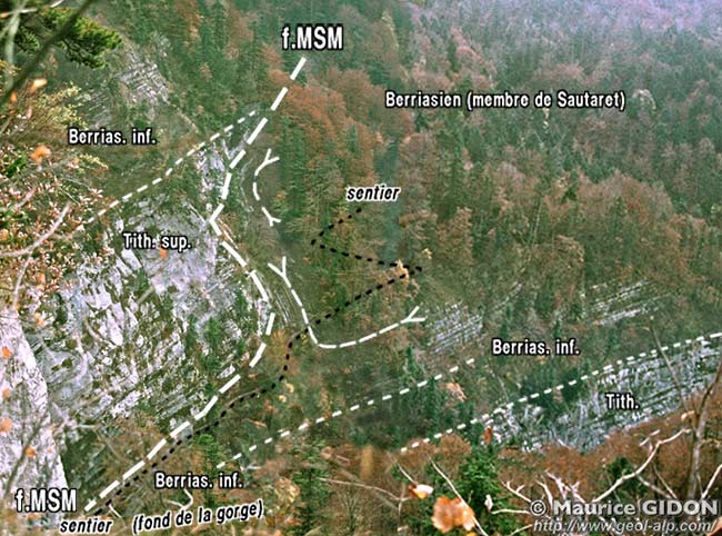 La fin de son tracé pour rejoindre le fond de ravin de Charminelle lui fait traverser en oblique descendant les couches de la barre tithonique : on voit alors que ces couches reposent sur des marnes de Sautaret formant le soubassement de cette barre : il y a là un redoublement de succession dont la position conduit à penser qu'il représente le prolongement septentrional de la faille de Mont-Saint-Martin.