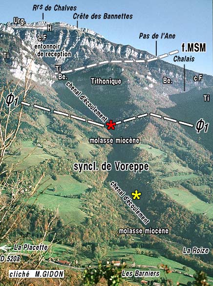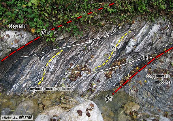 Mais on voit, plus en amont dans la pente de rive gauche, que cette surface de chevauchement plate n'est qu'un accident local du tracé d'une cassure ailleurs fortement pentée et très oblique aux couches. Cette analyse est suggestive pour comprendre