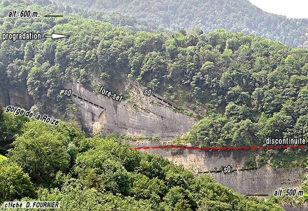 La portion inférieure de la gorge de cette partie du chenal d'écoulement, profonde et peu accessible, est entaillée dans les conglomérats molassiques du flanc oriental du synclinal de Voreppe. Ce flanc du pli n'y montre dans l'ensemble qu'un basculement vers l'ouest très faible (voire nul), mais les lits de conglomérats y sont néanmoins assez fortement pentés vers l'ouest par endroits. Cela provient de ce qu'ils étaient déjà inclinés, dès leur dépôt. De fait leur disposition géométrique témoigne sans équivoque de ce que les matériaux se sont accumulés là, par couches concentriques, sur le talus de la zone périphétique d'un delta (couches "prodeltaïques" = "fore-set").