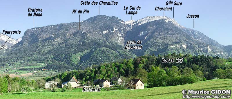 Depuis le sommet de la Grande Sure en direction du nord la crête s'abaisse progressivement jusqu'à être tranchée par le profond ravin de Chorolant. Celui-ci, qui prend naissance plus à l'est, au col de La Sure, donne du côté ouest, dans les pentes raides qui tombent sur Saint-Joseph de Rivière, une coupe relativement profonde et orthogonale aux structures majeures. Au delà de ce ravin le crêt des calcaires du Fontanil se reconstitue (quoique un peu atténué) en armant la Crête des Charmilles (1628 m). Mais ce crêt ne se poursuit guère dans son versant qui tombe vers le Guiers Mort, du fait de l'ouverture de la combe berriasienne qui héberge la Chartreuse de Curière (voir la page "Curière") : les calcaires du Fontanil n'affleurent plus alors qu'en constituant, au sud-est de cette combe, la falaise inférieure, du soubassement des Rochers de la Petite Vache. L'extrémité septentrionale du chaînon de la Sure est finalement constituée par le crêt tithonique de l'oratoire de None, que tranchent finalement les gorges du Guiers (voir la page "Saint-Laurent-du-Pont").