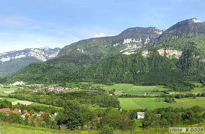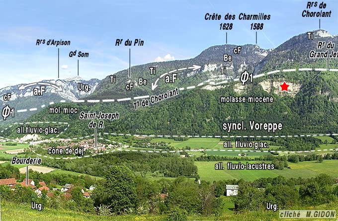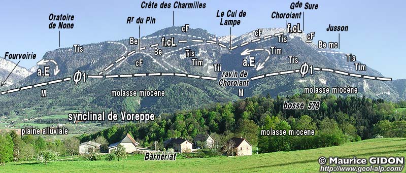 ![]() L'extrémité septentrionale du chaînon de la Grande Sure : versant ouest vu du nord-ouest, depuis le village de Grassetière au sud de Miribel (la bosse 579 masque la dépression alluviale de Saint-Joseph de Rivière). a.E = anticlinal des Égaux ; f.cL = faille du Cul de Lampe ; Ø1 = chevauchement de Voreppe (suite du panorama sur la gauche à la page "Saint-Laurent-du-Pont"). |
