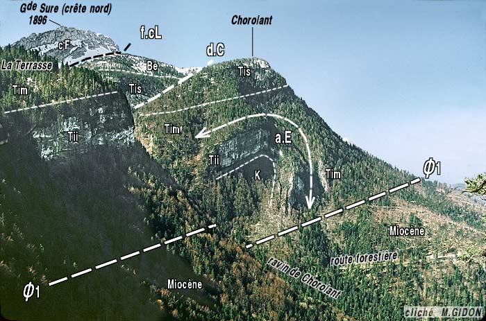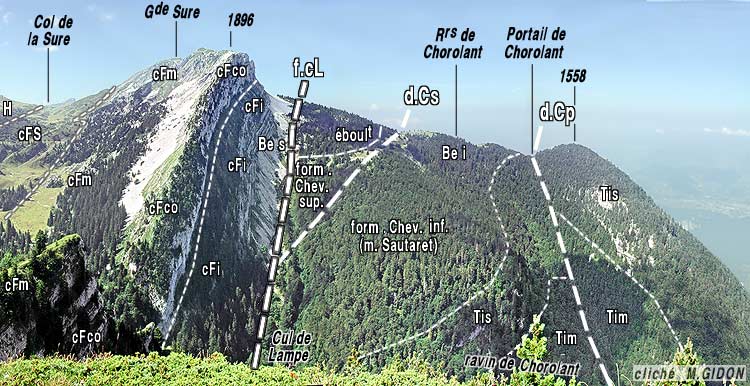 On a représenté en tirets bleus l'emplacement présumé de l'ancienne surface d'aplanissement. Légende stratigraphique : Le talus d'alpages, souvent dit "de l'Hauterivien", est en fait constitué par trois niveaux : les calcaires à miches (assez marneux) de l'Hauterivien supérieur (Hs), les calcaires lités à lits marneux de l'Hauterivien inférieur (Hi) et les calcaires du Fontanil tout-à-fait supérieurs (cFs). Les couches calcaires de la Sure (en grande partie à faciès "calcaires du Fontanil") peuvent être réparties entre 3 niveaux (pour les dénominations ci-après se reporter à la coupe de référence du Fontanil) : cFs = calcaires supérieurs ("à silex") brunâtres et à lits marneux "des Bannettes" ; cFm = calcaires lités du sommet de la barre "moyenne" ; cFCo = calcaires du Fontanil moyens, barre massive (= membre de la Rivoire) ; cFi =calcaires bioclastiques et argileux alternés (membre de Valetière) ; cChs = partie supérieure de la formation du Chevalon (= membre des Oullières). |