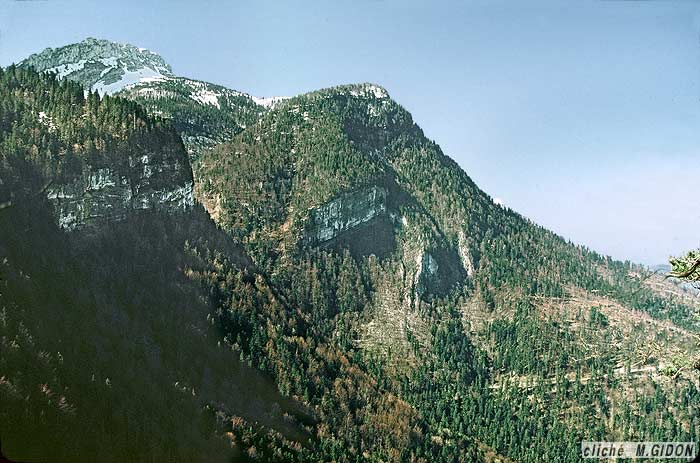 Le profil de la crête au nord du sommet jusqu'au point 1853, c'est-à-dire sur plus de 1 km (cliché ci-dessus) se singularise par le fait que son altitude reste sensiblement la même : cela s'interprète de façon très satisfaisante en considérant qu'il s'agit là d'un tronçon de l'ancienne ligne d'intersection des couches par la vieille surface d'aplanissement qui n'a pratiquement pas été rabaissé par les encoches qu'y ont pratiqué plus au nord (Cul de Lampe) et plus au sud (La Velouse) les attaques d'érosion remontante des têtes de ravins du versant ouest.