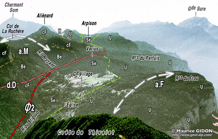 Les pentes en amont de La Ruchère, vues du nord depuis la Cime de La Cochette. Ø2 = chevauchement de la Chartreuse médiane ; d.D = décrochement du Pas Dinay ; a.F= anticlinal des Fourvoirie (flanc oriental seul). |