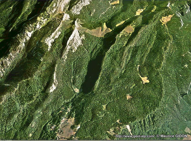 Cette crête, formée par des calcaires du Fontanil redressés presque à la verticale, se termine du côté septentrional en faisant place à l'échine de Varius, dont le relief est beaucoup plus effaçé, du fait qu'elle est constituée par des marno-calcaires sénoniens à faible pendage est. Ce changement correspond au décalage dextre occasionné par le décrochement du Pas Dinay dont on peut même localement (bois du Cernay) y observer que la surface de cassure est orientée N70 et inclinée à 60° vers le SE, conformément aux caractéristiques qui sont les siennes en rive orientale du vallon du Riou Brigoud.