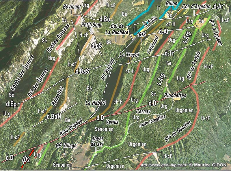d.A1 = décrochement de l'Alpette : faille nord de La Ruchère (Reverdys-Sermes) ; d.A2 = faille sud de La Ruchère (Grand Village) ; d.D = décrochement du Pas Dinay ; ds.E = décrochement sénestre des Éparres nord ; d.E = décrochement des Éparres ; d.Ba = décrochement du collet sud des Balmettes ; d' d" = décrochements secondaires (des Balmettes nord) intercalés entre d.D et d.E. |