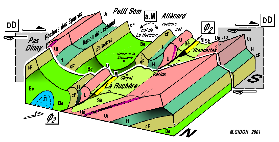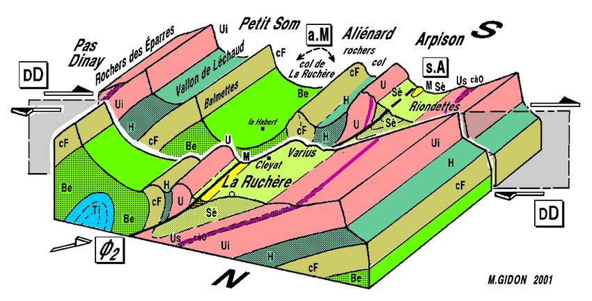 ![]() Bloc tectonogramme schématisé de la structure des environs méridionaux de La Ruchère vu du nord-ouest ; seuls sont figurés les accidents majeurs : DD = décrochement du Pas Dinay (prolongement sud-occidental du décrochement de l'Alpette) ; AM = anticlinal médian ("du Couvent") ; Ø2 = chevauchement de la Chartreuse médiane ; s.A = synclinal d'Arpison (prolongement septentrional de celui de Proveysieux). Même légende des couleurs que pour la carte ci-après. |