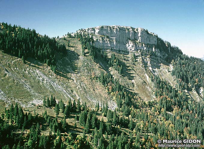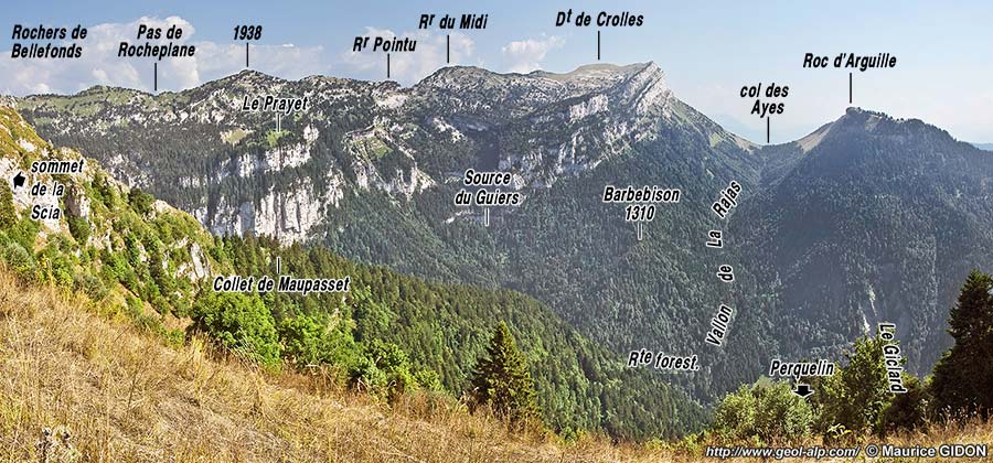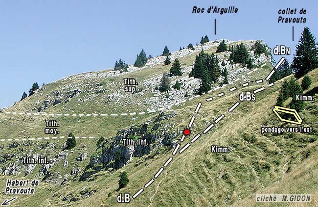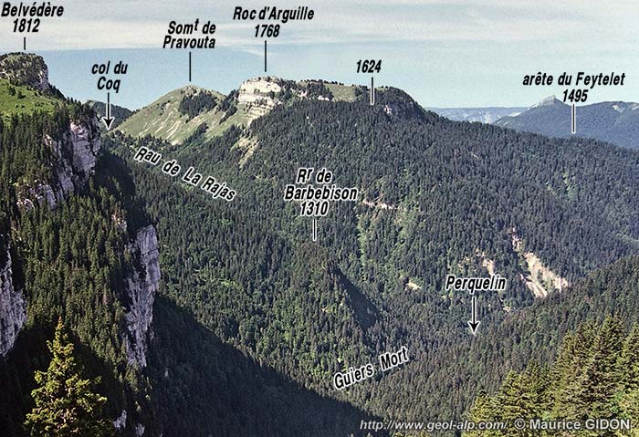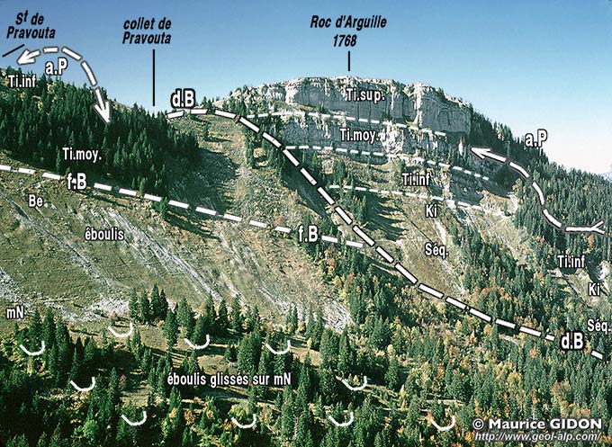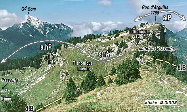 ![]() Le Roc d'Arguille, vu du sud, depuis l'échine nord de la croix de Pravouta. Les niveaux du Tithonique moyen sont formés de petits bancs qui déterminent un talus visible également dans la falaise du versant oriental (cf. photo de ce versant). a.hP = ondulation anticlinale du habert de Pravouta ; s.rA = ondulation synclinale du Roc d'Arguille ; a.P = anticlinal de Perquelin ; d.B = décrochement de Bellefond. |