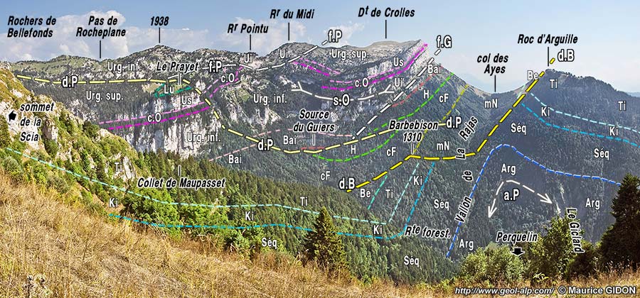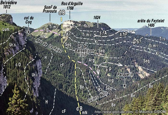 ![]() Le versant nord du col des Ayes et le vallon des sources du Guiers mort, vus du NE depuis les abords septentrionaux du chalet de Bellefond. f.B = faille du Baure (chevauchement vers l'est) ; d.B = décrochement de Bellefond ; a.P = anticlinal de Perquelin ; s.rA = ondulation synclinale du Roc d'Arguille ; a.hP = ondulation anticlinale du habert de Pravouta ; ØS = tracé (très hypothétique) du prolongement méridional du chevauchement de la Scia. |