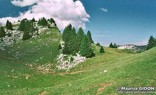 En fait sur le versant ouest de la crête de la montagne les couches de la partie occidentale de la voûte de l'anticlinal de Perquelin sont affectées, secondairement, par une ondulation synclinale, suivie par une ondulation anticlinale. La dalle tithonique de cette voûte anticlinale a été évidée par l'érosion, ce qui a ouvert la dépression fermée du chalet de Pravouta ; cette dernière qui présente un peu les caractères d'une doline* doit en outre avoir une origine karstique.