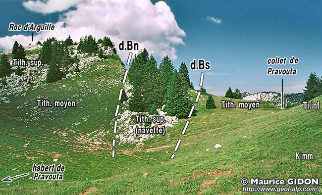 Dans les pentes occidentales du Collet le tracé du décrochement de Bellefond se repère d'abord par l'interruption qu'elle introduit dans la barre du Tithonique inférieur (qui domine directement la dépression du chalet de Pravouta). Plus bas, elle détermine le vallonnement qui borde du côté nord l'arête ouest du sommet de Pravouta et se prolonge ainsi, masquée sous les prairies ou les bois, avec un azimut qui la mène en direction du sommet de Chamechaude (où on observe effectivement son passage).