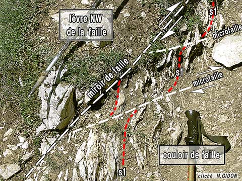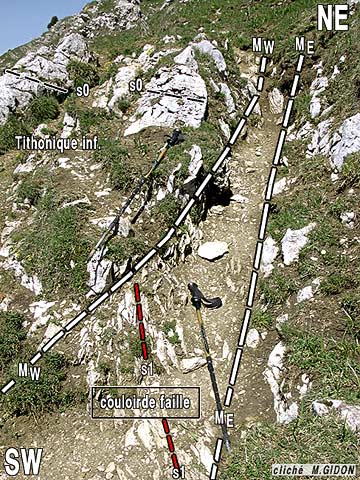Le sentier suit le couloir de faille, rempli de mylonite* feuilletée MW = miroir de la lèvre NW ; ME = miroir de le lèvre SE |