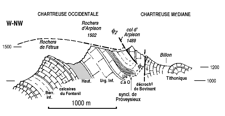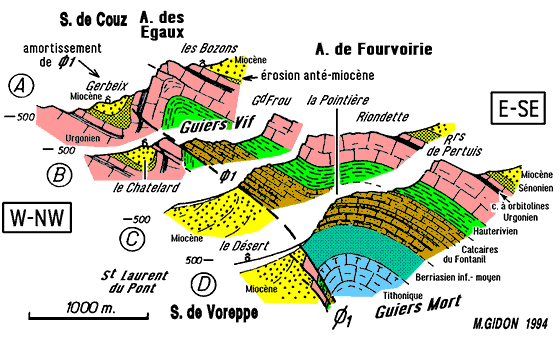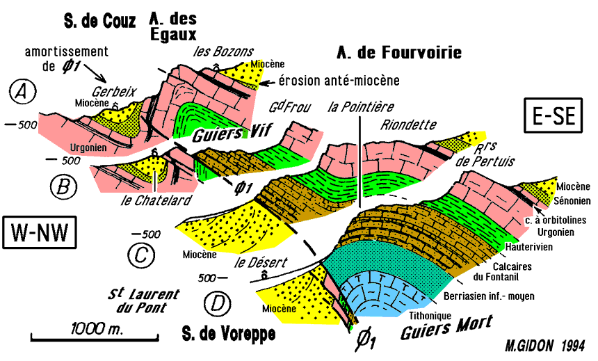 ![]() Série de 4 coupes le long du rebord occidental du massif de la Chartreuse. Ces coupes se succèdent du nord au sud (dans l'ordre A, B, C, D), depuis la vallée du Guiers Vif jusqu'à celle du Guiers Mort, presque dans le perspective du cliché prcédent. Elles sont perpendiculaires au chevauchement de la Chartreuse occidentale Ø1 dont l'anticlinal des Égaux apparaît un peu comme le crochon frontal. Le chevauchement sectionne d'autre part deux ondulations des couches, d'abord l'anticlinal de Fourvoirie, puis, plus à l'ouest, le synclinal "de la Ruchère". L'une et l'autre sont de larges torsions, orientées NE-SW (c'est à dire obliquement à la direction habituelle, plus méridienne, des plis du massifs : elles leurs sont donc « trans-axiales »). |