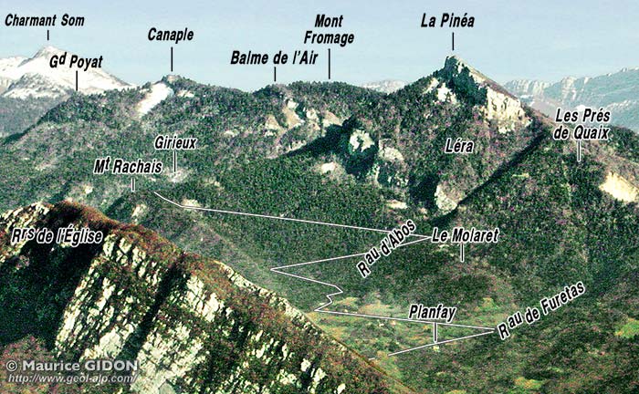 L'anticlinal du Rachais prend naissance peu au nord de Planfay (voir la page "Proveysieux") sous l'aspect d'une voûte anticlinale de calcaires sénoniens dont l'axe s'élève rapidement vers le nord ; mais cette voûte se couche à l'horizontale au nord du point coté 1206 de l'échine rocheuse boisée du Mont Rachais, à partir duquel cet anticlinal prend la forme d'un pli en genou déjeté vers l'ouest. Les calcaires sénoniens de cette voûte se prolongent vers le nord, avec la même disposition, par l'épaulement boisé du Bois Chourot puis, à la latitude de Canaple par celui des Plats.