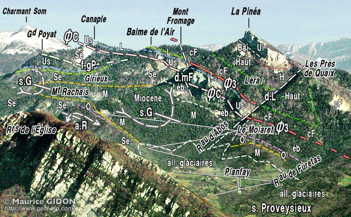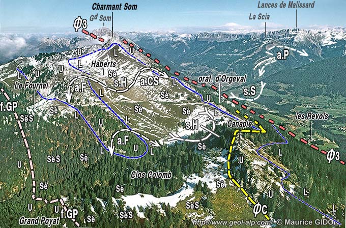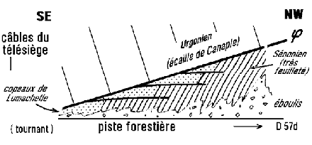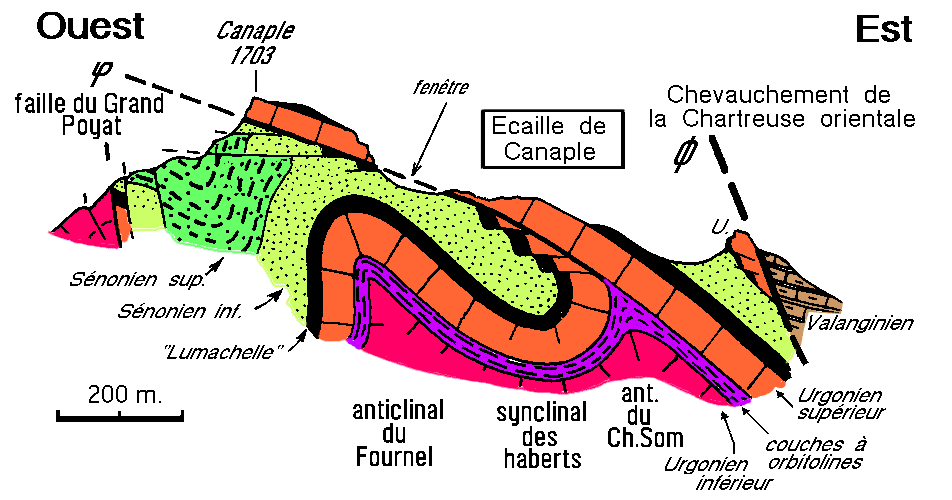 Le secteur de Canaple se signale surtout par une particularité structurale remarquable, qui est de relever d'un style tectonique peu répandu dans les chaînons subalpins, savoir un dispositif d'écaillage*, c'est-à-dire mettant en jeu des surfaces de chevauchement imbriquées. Ici il s'agit du chevauchement, sur la voûte du dispositif anticlinal de Charmant Som, d'une "écaille de Canaple" dont on constate, dans le versant est de la montagne, qu'elle se dispose en imbrication sous le chevauchement de la Chartreuse orientale. Ce dispositif est est donc comparable en miniature à celui observé dans les pays de nappes de charriages. |