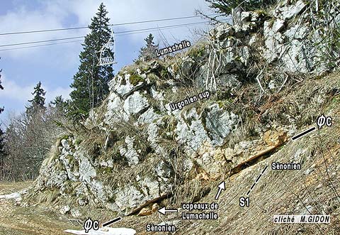 ![]() schéma interprétatif : La surface basale de la lame urgonienne ( NB. : depuis 2012 cet affleurement n'est plus observable, par suite de l'éboulement d'un pan de quelques mètres à partir de l’Urgonien de son toit et d'une invasion consécutive par la végétation : il reste à espérer que les services de l'O.N.F. ou du Parc de Chartreuse auront les moyens et l'occasion de le rafraîchir .. |