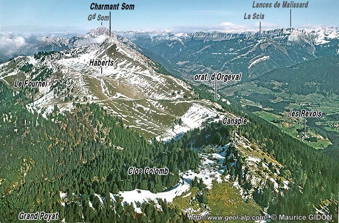 Le cliché ci-dessus montre la coupe naturelle de cette structure qu'offre la vue que l'on en a depuis les pentes du Charmant Som en regardant vers le sud. En effet la situation de ce point d'observation est favorable à cette analyse, du fait que toutes les structures s'enfoncent vers le sud, et qu'elles le font avec une pente proche de celle du regard porté depuis ce point. Comme l'altitude de la crête s'abaisse moins vite on s'élève dans l'édifice structural lorsqu'on parcourt du regard cette crête depuis le nord vers le sud. |