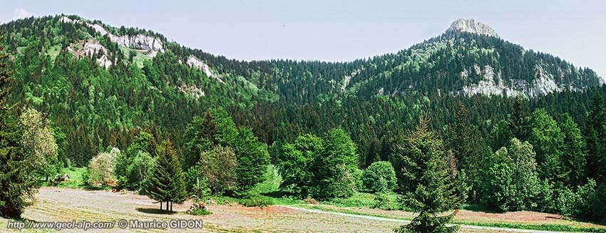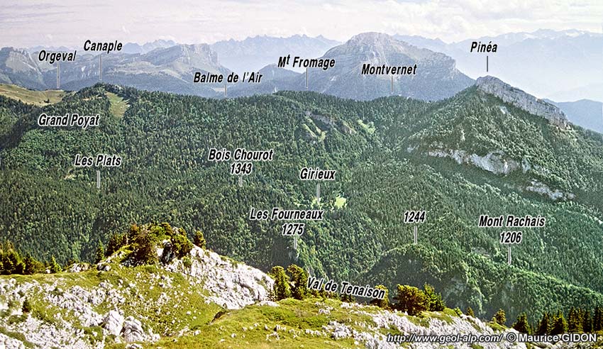 B/ Au sud du sommet de Canaple la crête boisée se poursuit jusqu'au Montfromage en suivant le dos de la barre urgonienne qui constitue l'essentiel de l'écaille de Canaple : souvent garnie de Lumachelle sur son versant est se dénude, au belvédère des Balmes de l'Air en dalles structurales urgoniennes du fait qu'elles y sont dénudées par l'entaille remontante de la ravine qui descend au nord-est du sommet du Montfromage (et que traverse la route pastorale au tournant rentrant 1374).