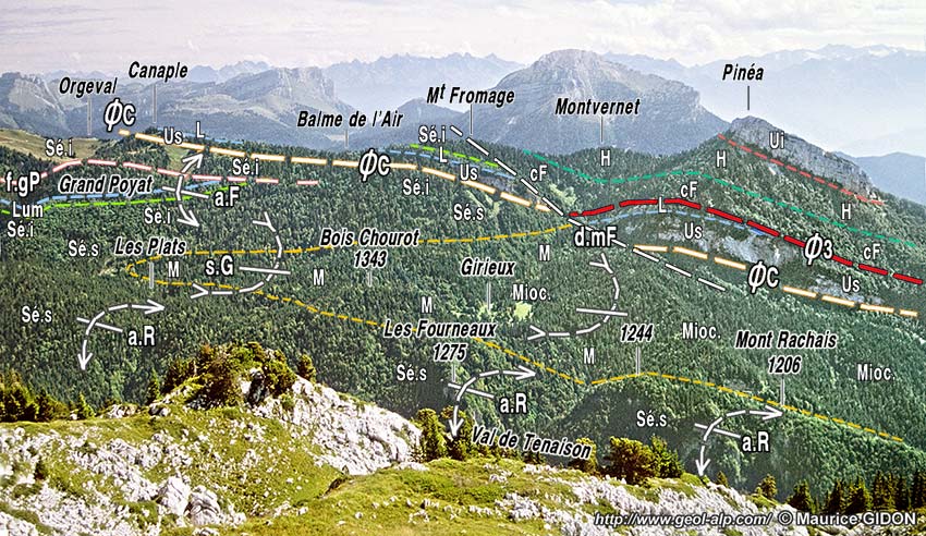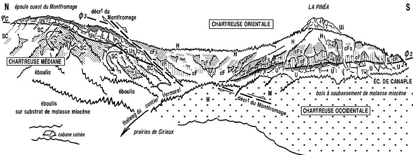 ![]() Coupe interprétative concernant la partie basse de la photo : l'orientation, ouest à droite, est choisie pour être la même que sur la photo. Ø = chevauchement de la Chartreuse orientale ; ØC = chevauchement de l'écaille de Canaple. (commentaires explicatifs dans le texte ci-après) |