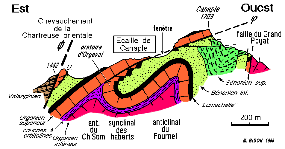 C'est très vraisemblablement par un "effet d'entraînement" sous l'avancée du chevauchement de la Chartreuse orientale que l'écaille de Canaple a été ainsi décollée (au niveau des couches à Orbitolines) et entraînée vers l'ouest. D'autre part le fait que la surface de chevauchement sectionne le Sénonien de la voûte de l'anticlinal du Fournel montre que ce chevauchement a fonctionné alors que les plis de l'anticlinal médian chartreux étaient déjà dessinés.
