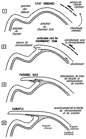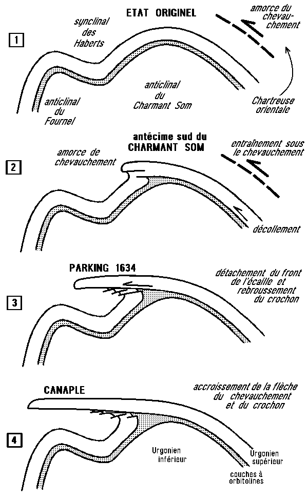 Individualisation progressive de l'écaille de Canaple. Le décollement progressif de l'écaille, aux dépens du flanc E de l'anticlinal du Charmant Som, s'accentue du nord au sud depuis le Charmant Som (où l'on ne rencontre que de modestes ébauches de chevauchement vers l'ouest de l'Urgonien supérieur), en passant par le parking 1634 (de l'oratoire d'Orgeval), où le crochon est déjà amplement dessiné. Ces schémas mettent en évidence le rôle de l'"entraînement", sous l'effet de l'avancée du chevauchement de la Chartreuse orientale, qui est probablement à l'origine du décollement de l'écaille. L'ordre de numérotation de ces coupes évoque