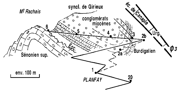L'inclinaison, vers la gauche, de la surface du chevauchement de Canaple (ØC) correspond pour une large part au plongement axial, vers le sud, qui affecte toutes les structures de ce secteur. Il aurait fallu nettoyer la surface des affleurements du compartiment chevauché pour mettre en évidence les fins détails qui sont représentés sur le schéma ci-après. |