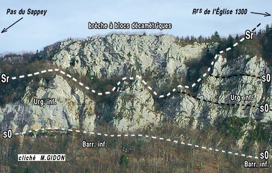 Le matériel éboulé repose sur l'Urgonien par une surface de "ravinement". C'est-à-dire que les surfaces de stratification (s0) de l'Urgonien sont tranchées par des ravines affectant la paléo-surface topographique (Sr), que l'épandage ébouleux a fossilisé. Cette géométrie correspond à l'ablation de plus de 200 m d'épaisseur de couches, qui ont été remplacées par des débris provenant de plus haut. Au sein de ces derniers on distingue de gros blocs, dont certains ont un diamètre plus que décamétrique, de la taille d'un épicéa.