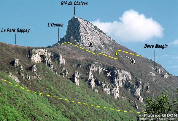 Les tirets jaunes délimitent la tranche de roches de l'effondrement du Petit Sappey. On a indiqué par "s0" le pendage des couches en divers points de la masse éboulée et de la roche en place des Rochers de Charves pour en souligner la différence.