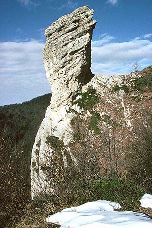 Ce changement de relief correspond au fait que le crêt urgonien est remplacé là par une masse rocheuse, toujours formée par de l'Urgonien, mais dont la structure ne prolonge en rien celle en dalles très redressées qu'il a aux Rochers de Chalves et de l'Église.