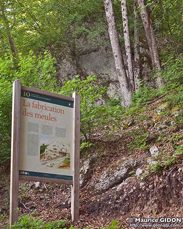 Un des sites d'extraction des meules (point 10 du parcours) montrant en arrière-plan un des énormes blocs éboulés, partiellement entaillé d'alvéoles d'extraction et un fragment de meule à droite de la pancarte.