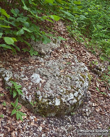 Noter l'inclinaison vers la gauche, c'est à dire vers le sud, des lits d'éboulis formant la brèche : elle indique qu'ils proviennent bien des abrupts des Rochers de Chalves.