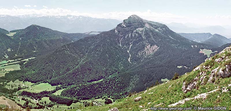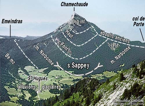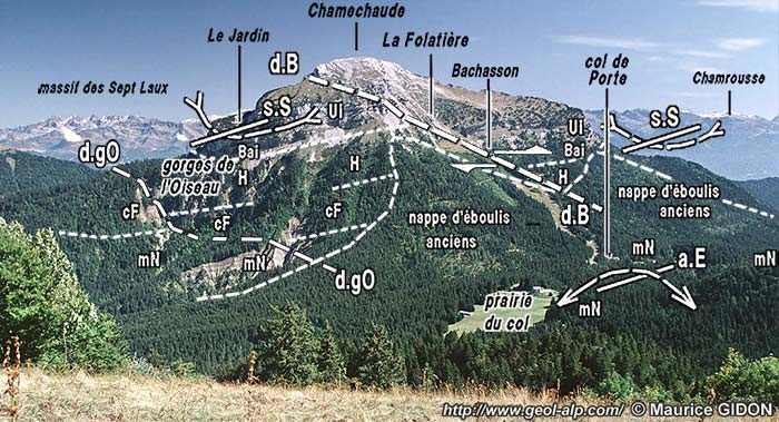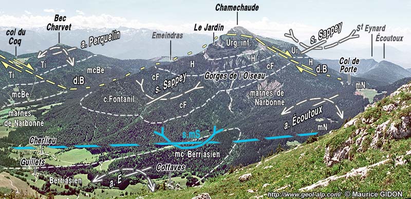 ![]() La montagne de Chamechaude vue du NW depuis le sommet du Charmant Som. dB = décrochement de Bellefond et son prolongement (des Bachassons), du versant ouest de Chamechaude ; s.mS (en bleu) = synclinal "méso-subalpin" (orienté N45 il recoupe les autres plis en oblique). Les formations quaternaires (et notamment le vaste épandage d'éboulis anciens de ce versant) ne sont pas représentés pour ne pas allourdir la figure (voir ces aspects sur les clichés suivants du versant ouest). |